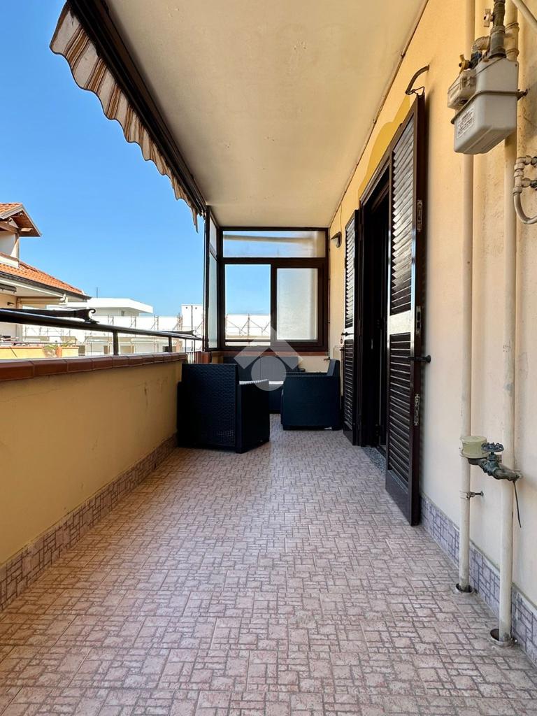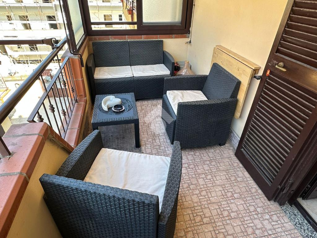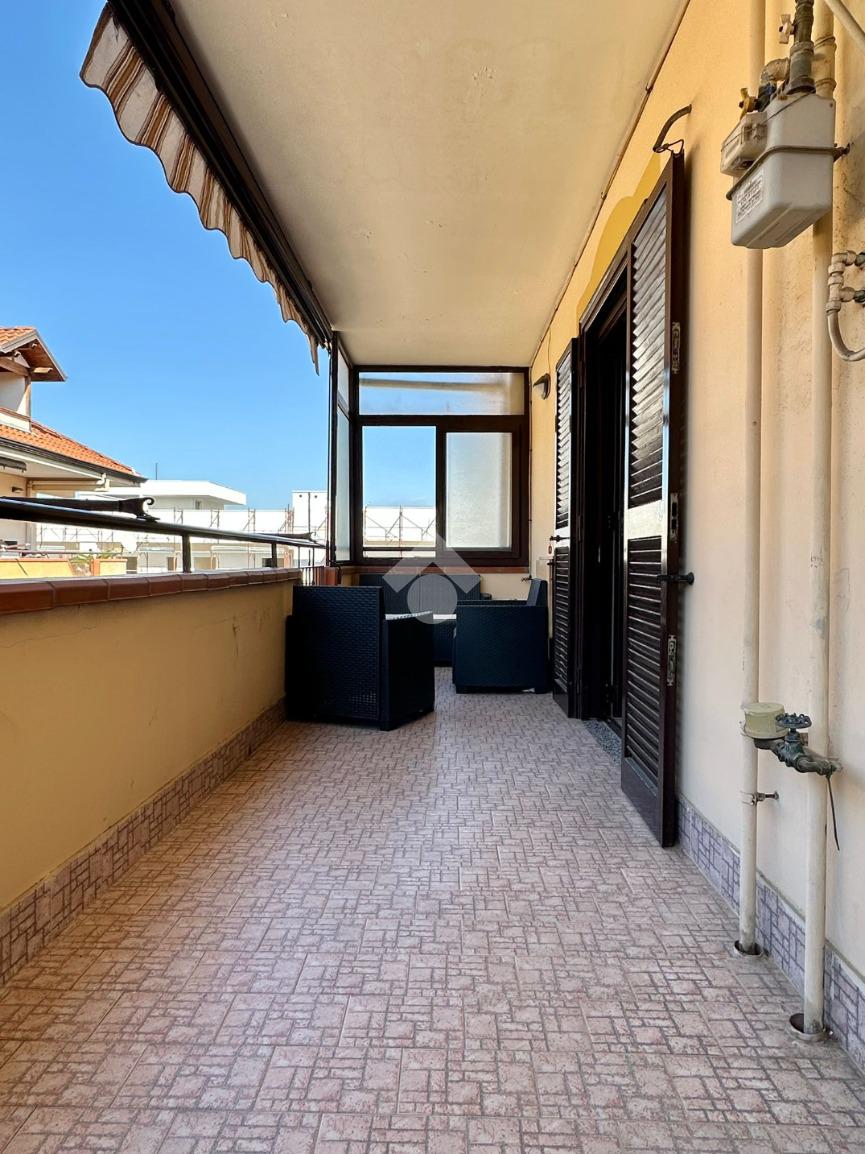 Ingresso in ampio salone living con cucina a vista con accesso al balcone, camera da letto matrimoniale anch’essa con affaccio su balcone, bagno con vasca e balcone e comodo ripostiglio.